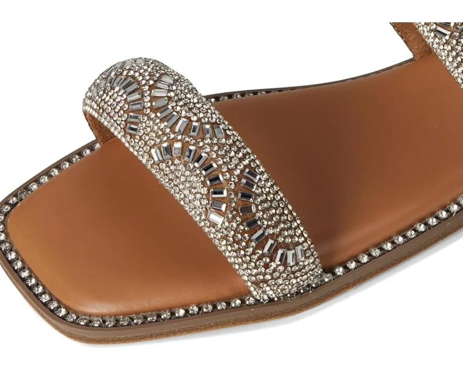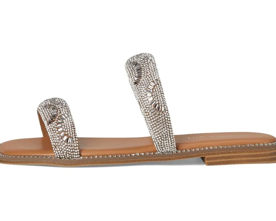 - The Madden Girl® Partly is a flat sandal favorite, featuring a flat heel, squared open toe and slip-on closure. It is designed with microsuede upper material and rhinestone embellishments.