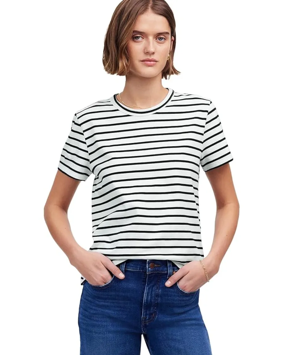 - The Madewell® Cotton Perfect Crewneck Tee Stripe is your go-to essential, blending effortless style with all-day comfort. Crafted in soft, breathable cotton, this versatile top is designed with a regular fit that flatters every figure without feeling too snug or too loose. The classic crew neck keeps it laid-back yet polished, while the short sleeves make it perfect for layering or wearing solo when the sun is out. A true pull-on staple, this tee slips seamlessly into your everyday rotation.