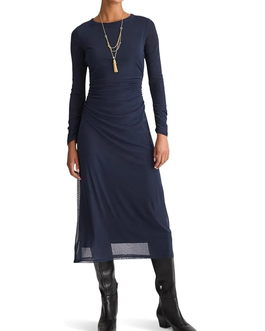 - The Madewell® Irina Dress Mesh is fully lined throughout the body with sheer long sleeves, offering a flattering look and comfy feel. Crafted in stretchy mesh, this midi dress is designed with a jewel neckline, a ruched waist, and a straight hem. Make your fashion statement wearing this mesh dress.