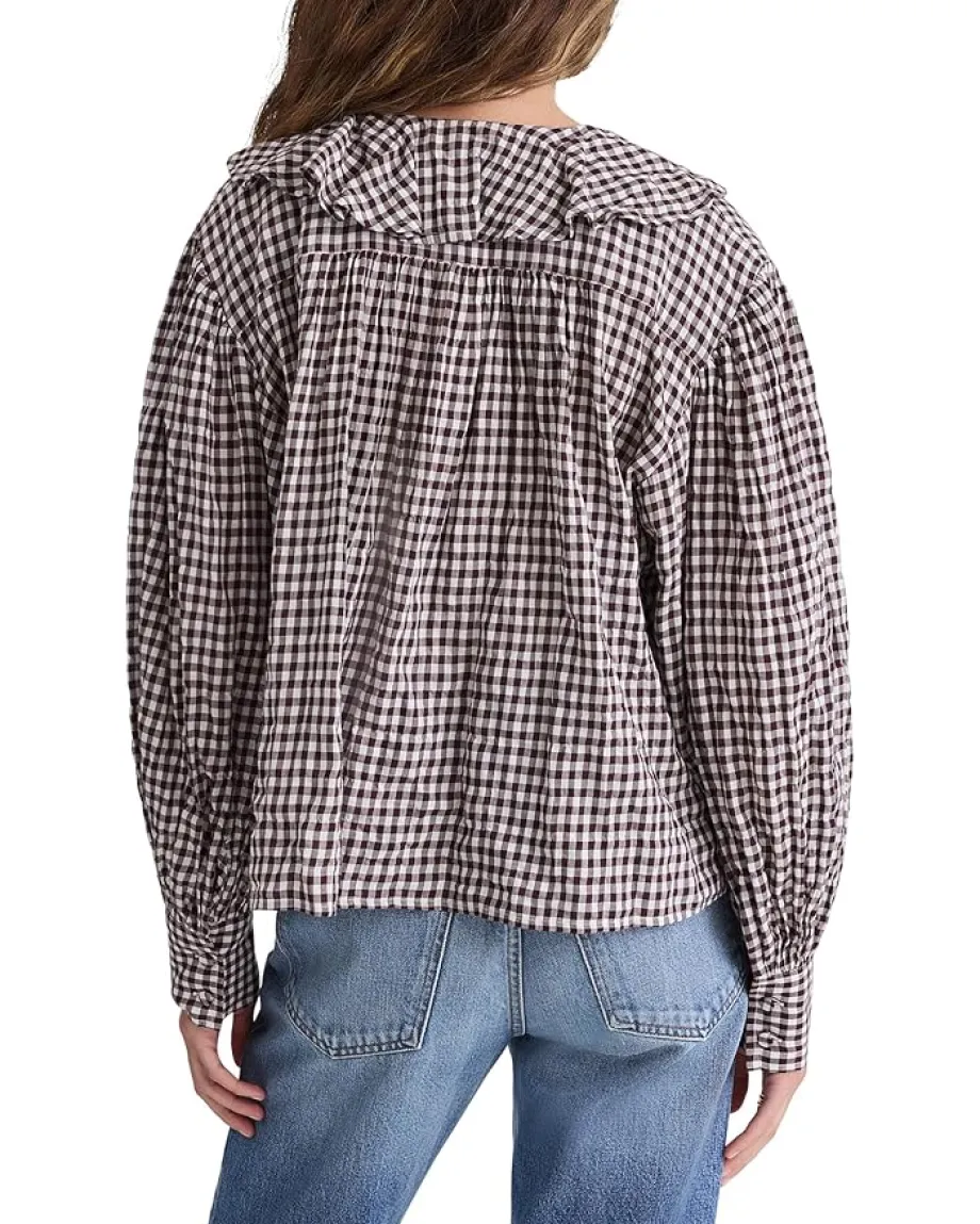 - The Madewell® Marciana Top captures modern femininity with a touch of timeless charm. Designed in a regular fit that flatters every frame, this piece exudes relaxed sophistication for any occasion. The graceful V-neckline framed with delicate ruffles adds a soft, romantic flair, while long sleeves with button cuffs create a polished, versatile look you can dress up or down with ease.