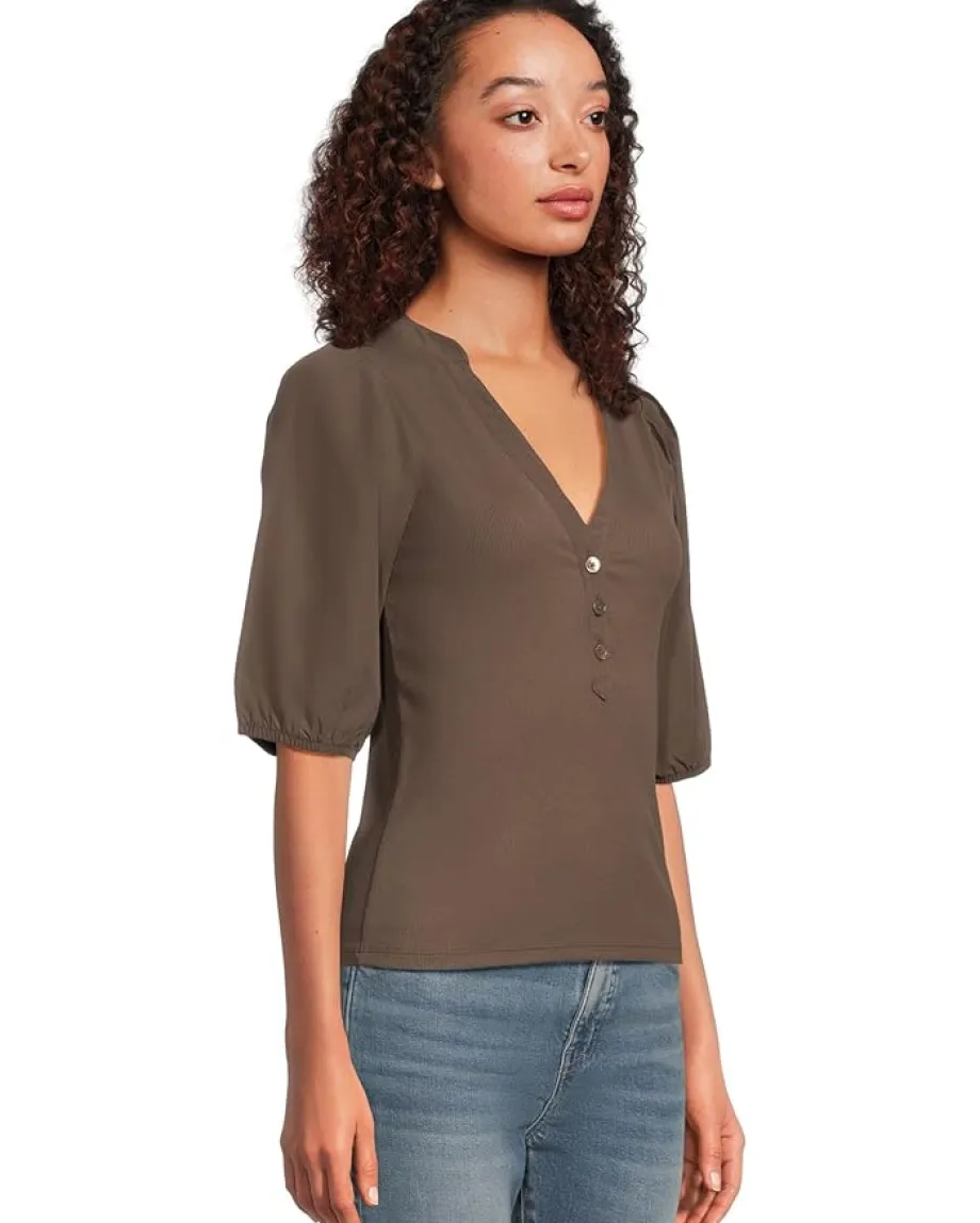 - The Madewell® Mixy V Neck Puff Tee is a great choice whether you’re getting ready for work or dressing up for a casual outing. Made from a Lyocell® blend fabric, this stylish top features short puff sleeves, a V-neckline, and a straight hem. The three-button front placket ensures easy wear. This button-down top makes a great addition to your wardrobe.