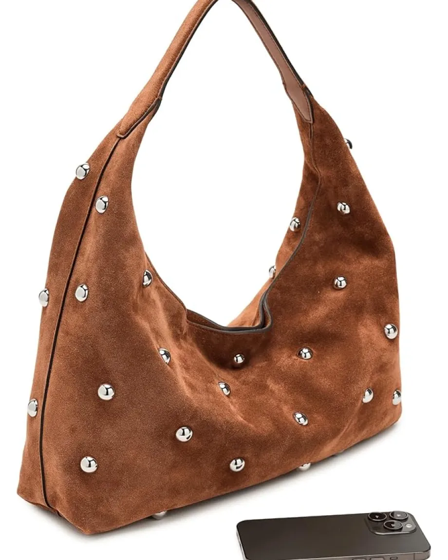 - Embrace laid-back luxury carrying the Madewell® Suede Slouchy Shoulder Bag in Stud. Crafted from buttery suede, this spacious shoulder bag offers a relaxed silhouette that effortlessly complements any outfit. Adorned with subtle metallic studs that add a touch of modern edge without overpowering the classic design.