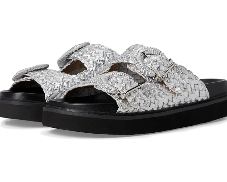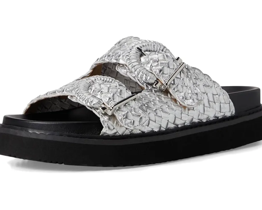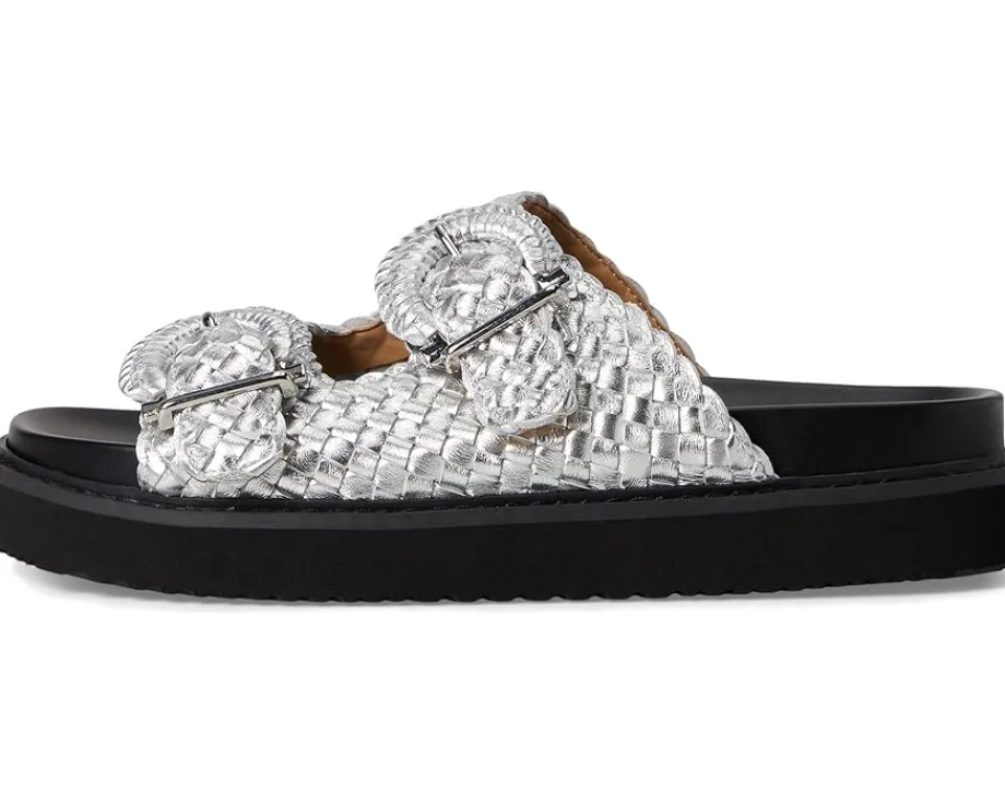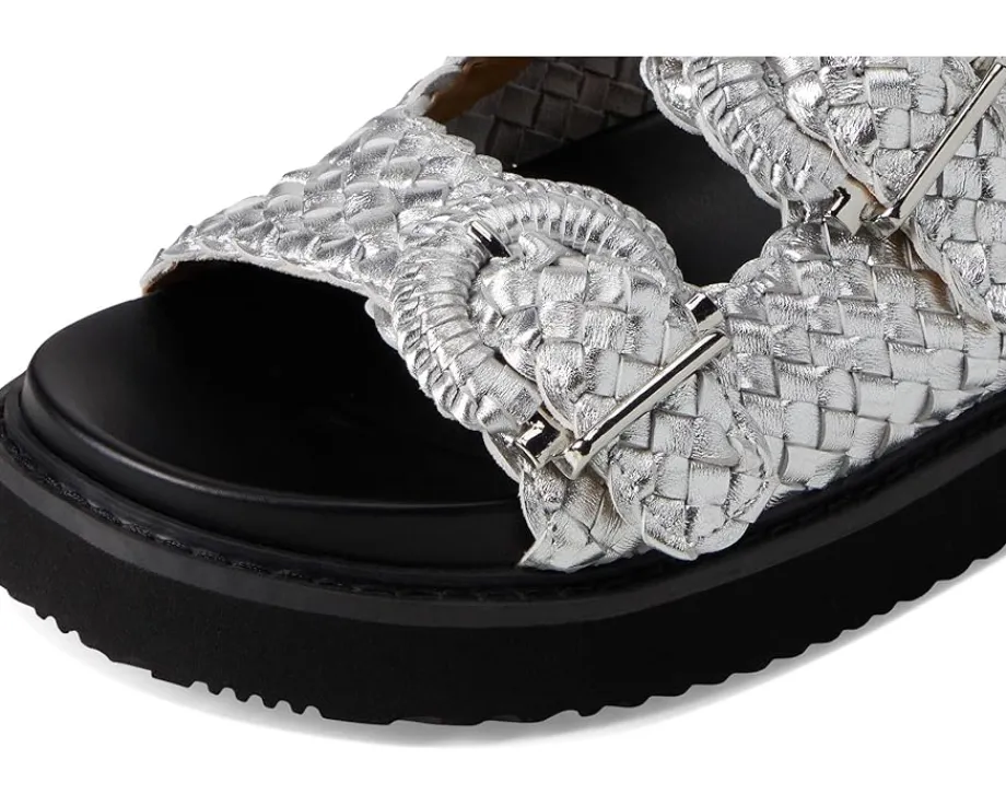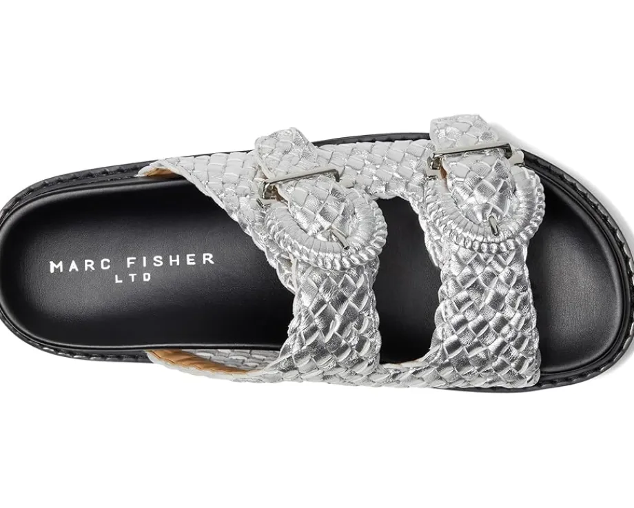 - Add glam to your casual look wearing Marc Fisher LTD™ Auggie Sandals. These feature a woven detailing, slip-on design, and two buckled straps along with an open round toe shape. The sandals are crafted with a leather upper and man made lining.