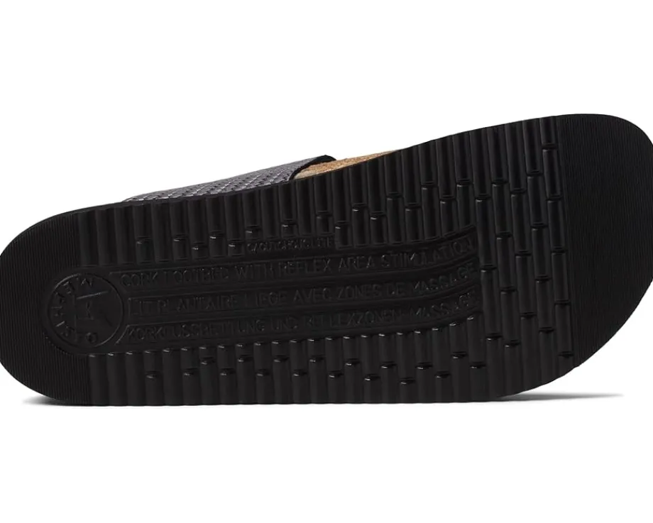 - Cork footbed lined with leather that softens over time for proper heel, arch, and foot support when walking.
