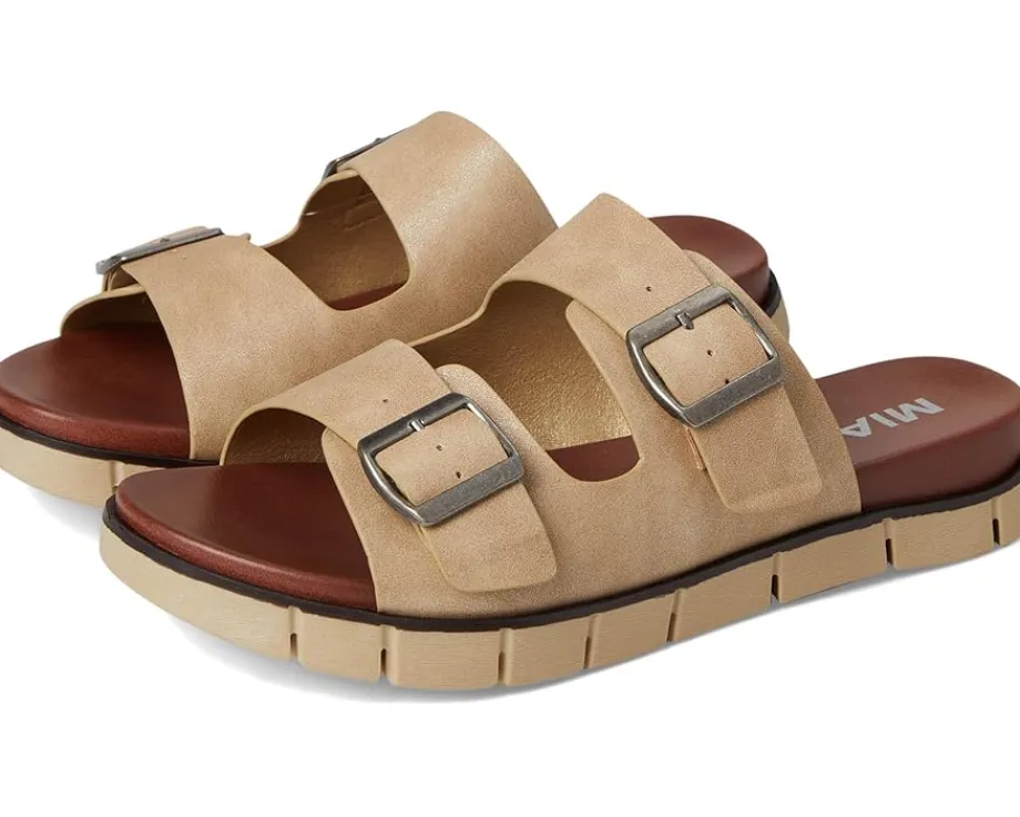 - Enjoy the ultimate comfort wearing the MIA™ Esei. Crafted from faux leather upper, lining, and insole, this pair of sandals features open round toe, suede and a sneaker bottom sole, signature brand detailing on the footbed, double buckle strap detailing, slip-on style, and contoured footbed.