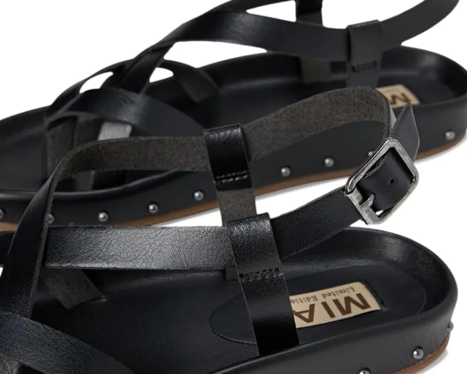 - The MIA™ MLE-Zurie-S flat sandal boasts a sleek design with adjustable buckle closure at the slingback. With studded adornments, the footwear features an open almond toe silhouette.