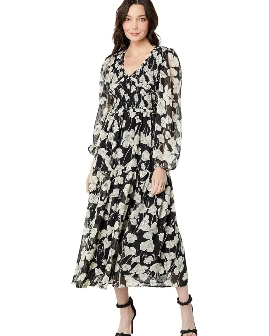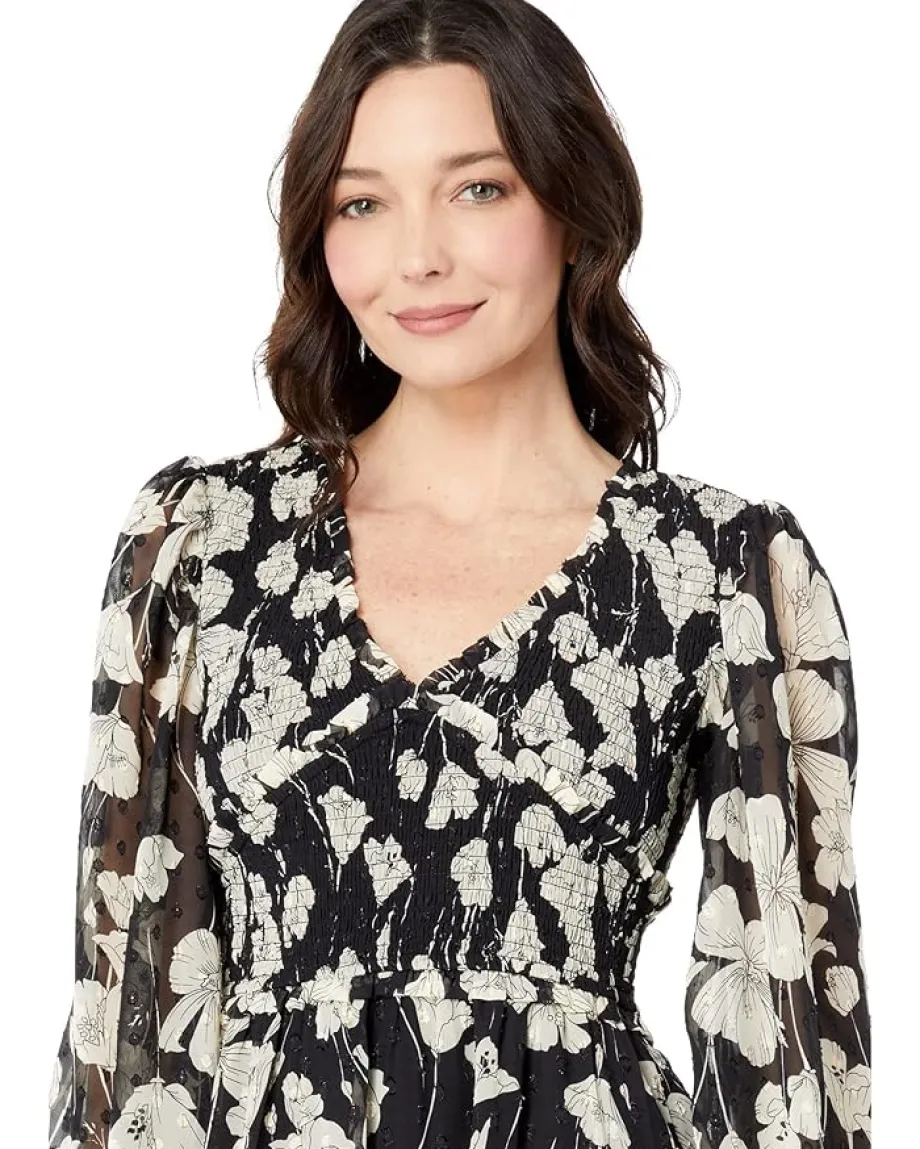 - Enjoy the breezy vibes in the charming floral print MOON RIVER™ Floral Smocked V-Neck Midi Dress.