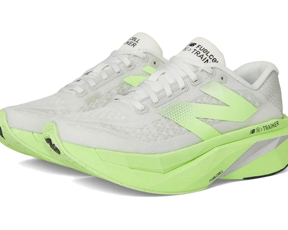 - The New Balance® FuelCell SuperComp Trainer v3 is a high-performance running shoe built for half- and full-marathon training, combining plush cushioning with energy-efficient design. It features a FuelCell midsole foam with approximately 3% bio-based content, offering a propulsive feel. The Energy Arc system integrates a sport-specific carbon fiber plate with strategic midsole voids to maximize energy return, while the angular midsole design helps reduce overall weight. A durable rubber outsole ensures superior traction across varied surfaces, making it ideal for long-distance runners seeking comfort and speed.