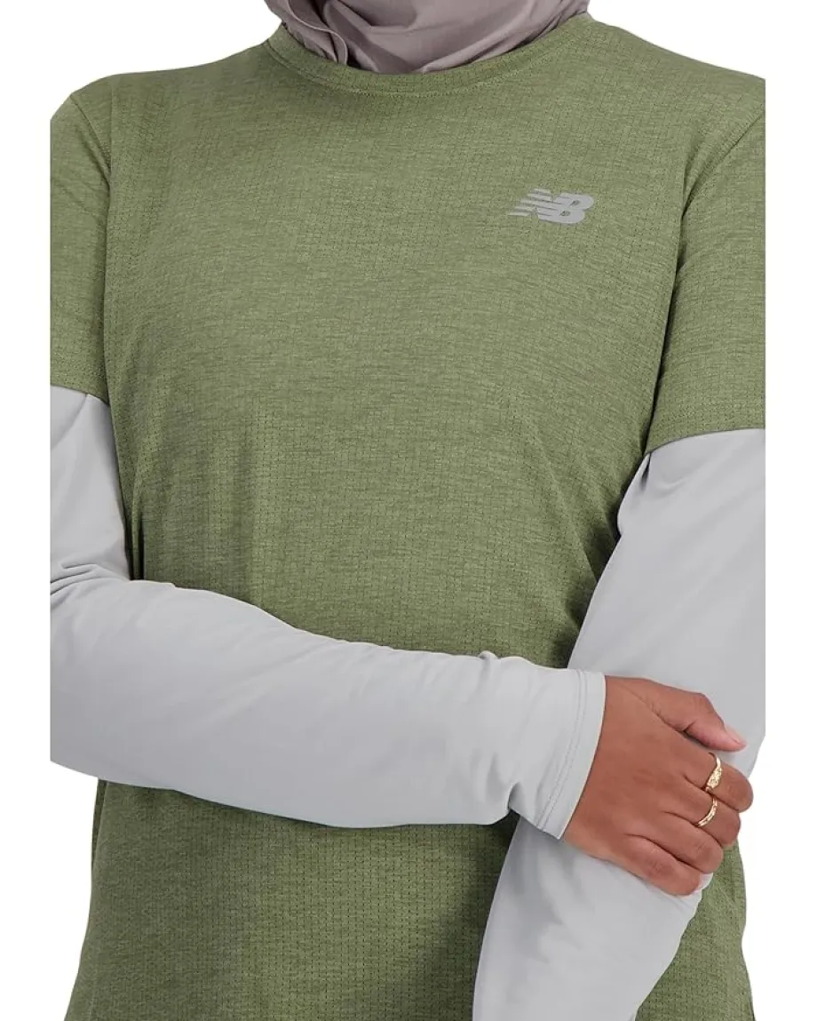 - Behold the zenith of environmentally-conscious sportswear: the New Balance Women’s Athletics T-Shirt Heather. Crafted for the environmentally conscious athlete, this breathable masterpiece features NB ICEx technology for rapid cooling. Reflective logo for visibility, short sleeves, crew neck, and the iconic brand emblem on the chest.