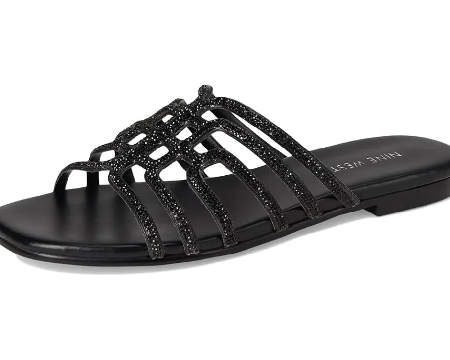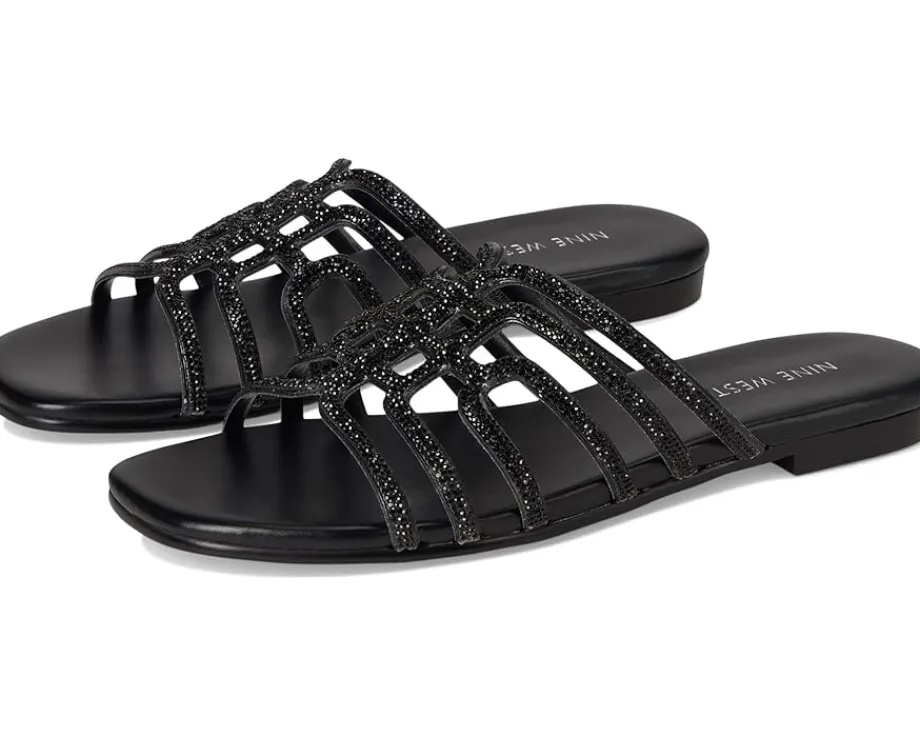 - Complete your look in the Nine West® Timy dress flats. They feature a modern square toe shape, strappy silhouette, and embellishments on the straps. These slide sandals are made of a polyurethane upper, cushioned footbed, and polyurethane lining. These flat sandals are anything but boring and sure to impress.