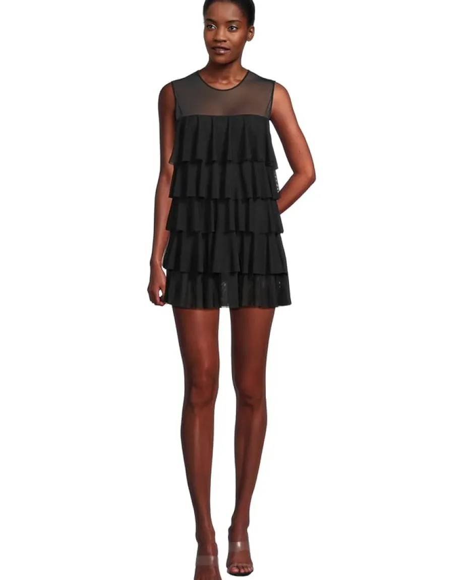 - The Norma Kamali® Sleeveless Tiered Ruffle Pickleball Dress combines a slim fit with playful ruffle tiers and a built-in stretch bodysuit, featuring a sleek crew neckline and sleeveless design for effortless movement and style on the court.