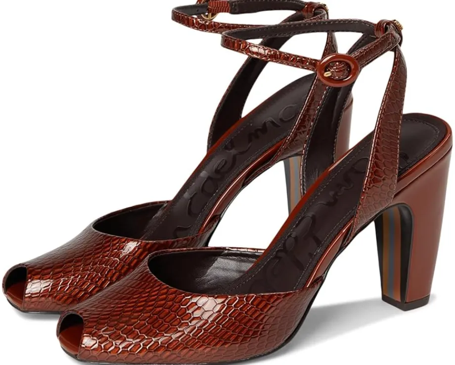 - The Sam Edelman® Wrenna Mule Shoes are where vintage elegance meets today’s bold edge. Designed with a sleek leather upper and a standout textured finish, these heels exude retro-inspired glamor while staying fashion-forward. The stylish peep toe and classic ankle strap with a polished buckle closure add timeless charm, while the slim stiletto heel elongates your silhouette for a confident stride. Crafted with a faux leather lining, soft polyester insole, and durable PU outsole, they balance comfort with sophistication.