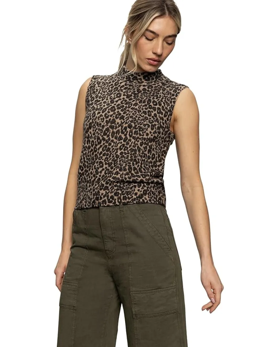 - Add a touch of fun to your look choosing the Sanctuary™ Fuzzy Shell top! Featuring a ribbed mock neckline and a playful animal print pattern, this top is a must-have for any fashion lover. The sleeveless style and straight hem offer a flattering fit that can be dressed up or down for any occasion.