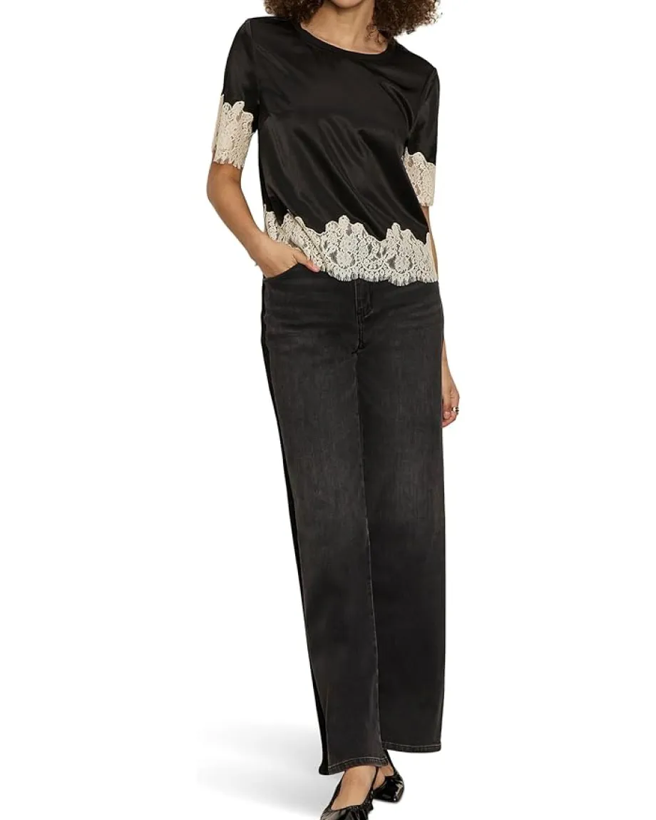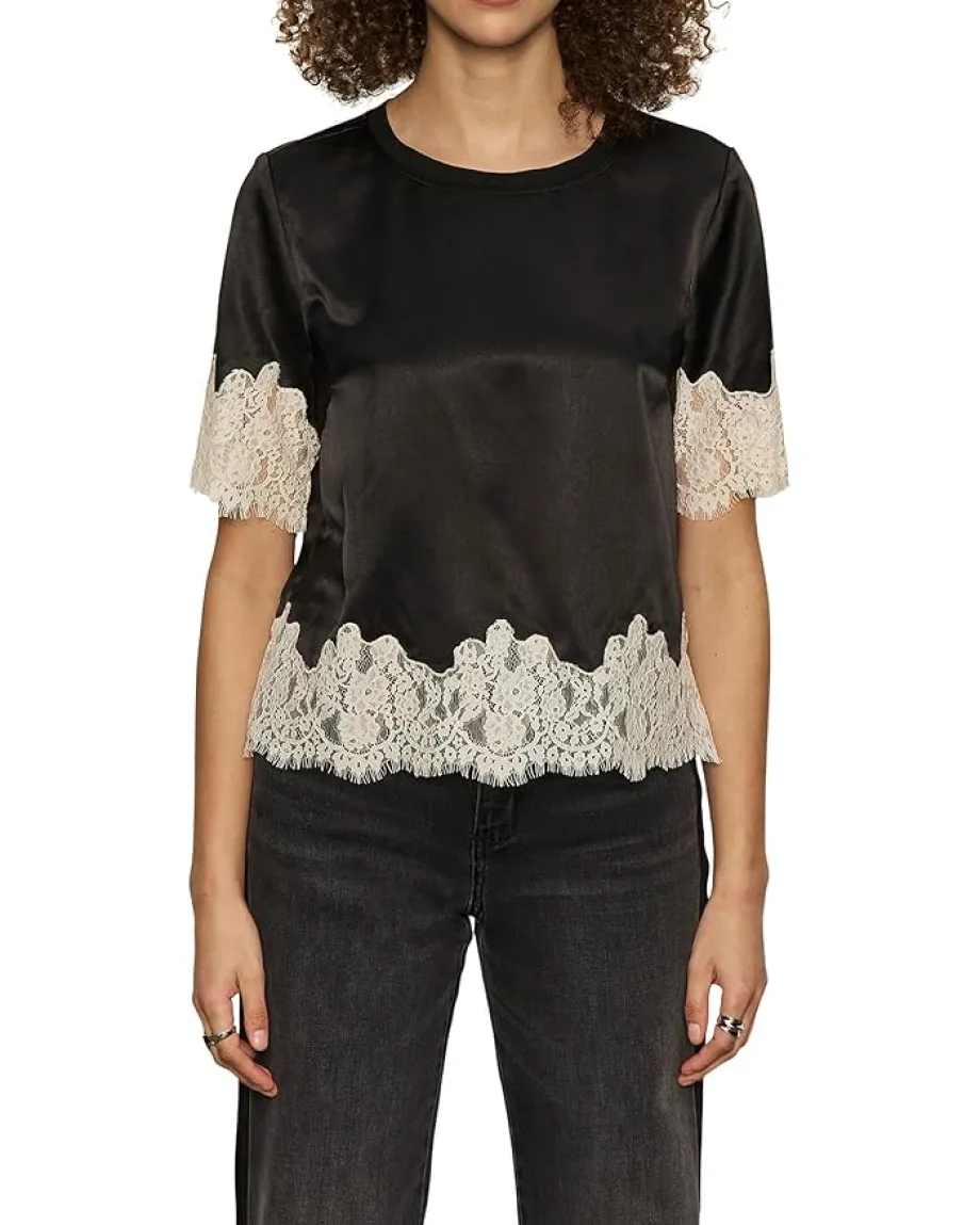- Simple and sophisticated in style, the Sanctuary™ One Of A Kind Satin Lace Top is perfect for everyday wear. The pull-on style top features a crew neck, short sleeves with lace details, and a standard-length silhouette with a beautiful lace hem.