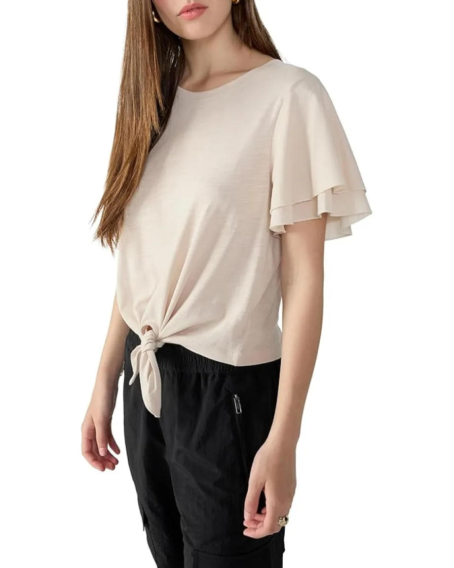- Want to bring a charming update on your casual style? Then, get your hands on the Sanctuary™ Tied Together Forever Top today! It is fabricated in cotton slub jersey and features a timeless crew neckline coordinated with poplin flutter sleeves for a feminine vibe.