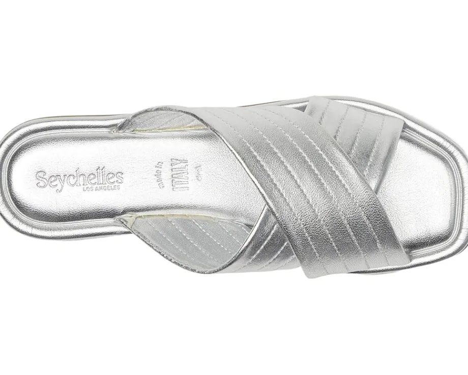 - Shimmer, slide, and shine-the courage sandal has arrived! Slip into effortless elegance wearing the Seychelles® Courage Metallic Leather Slide Sandal. Featuring a luxe leather upper that gleams in the light, these chic cross-band slides elevate any outfit with ease. The PU lining and faux leather insole provide a soft, cushioned feel, while the durable synthetic rubber outsole ensures a steady step. Designed for easy slip-on wear, they’re the go-to choice for seaside strolls, city escapades, or leisurely farmers’ market visits.