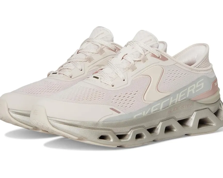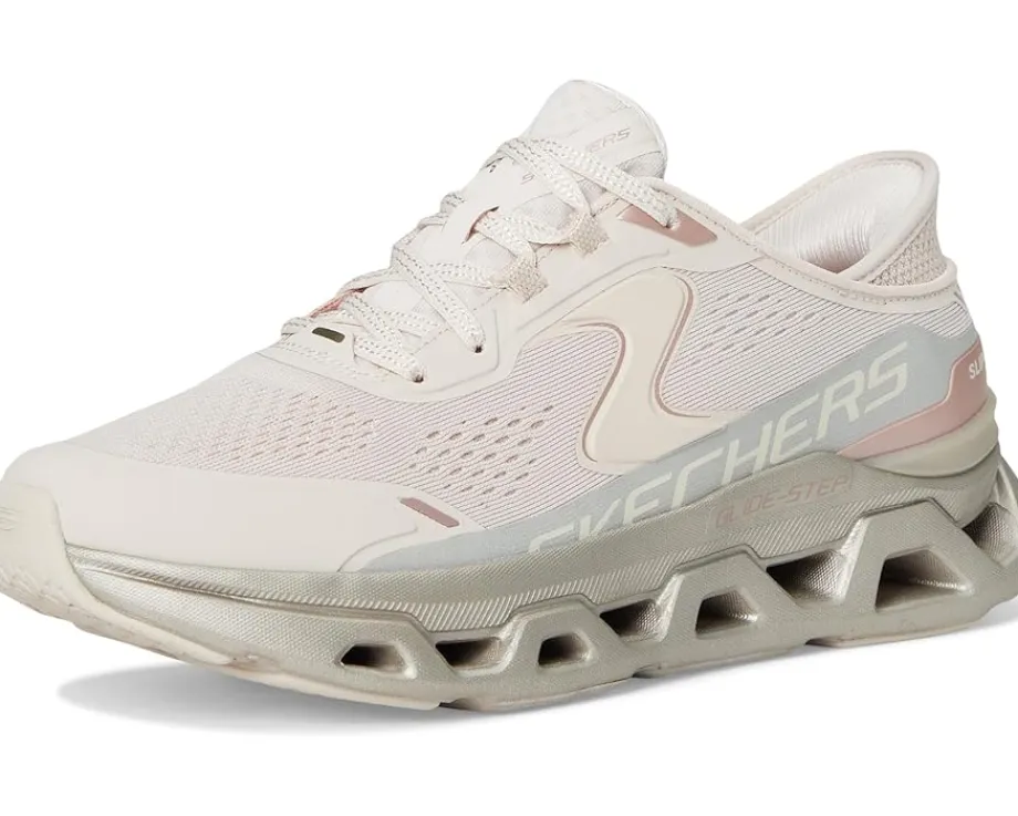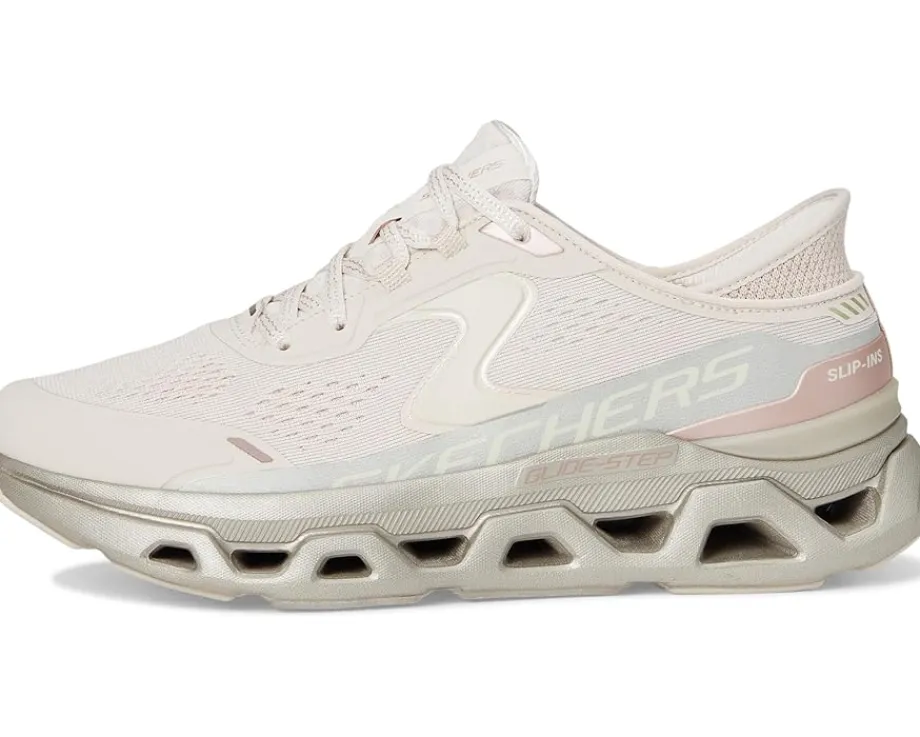 - The SKECHERS® Glide-Step® Altus – Starlight Shine Hands Free Slip-Ins™ deliver a futuristic feel with all-day function. Featuring a dazzling Metallic Swan engineered mesh upper with hotmelt overlays, these kicks radiate glam while staying breathable and flexible. Glide-Step® technology energizes every move with responsive, lightweight cushioning, while the signature Air-Cooled Memory Foam® insole keeps your feet feeling fresh and supported. With its innovative Heel Pillow™ design, just slip in and go, no bending needed. Rubber outsole traction keeps you steady, and the secure lace-up front offers an adjustable fit.