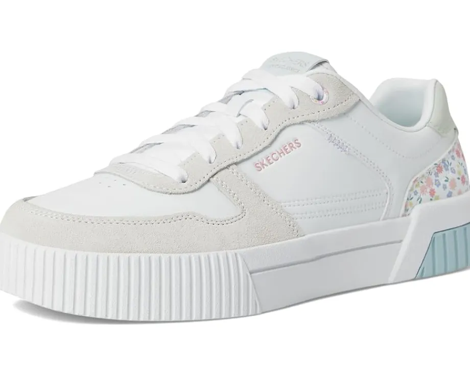 - Enjoy perfectly styled court comfort wearing the SKECHERS® Jade sneakers. This low-top lace-up features, a Molded rubber cupsole, and a Skechers Air-Cooled Memory Foam® cushioned comfort insole. The court style sneakers have duraleather and genuine suede overlay upper with floral print heel cup and polyester lining.
