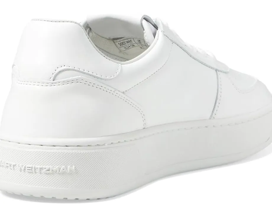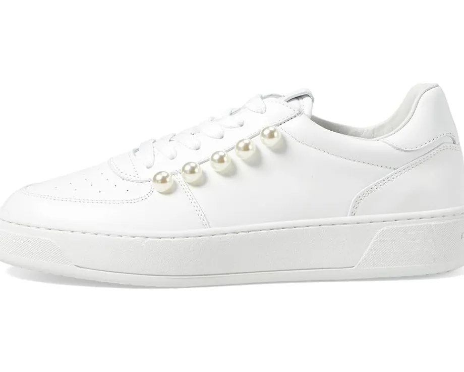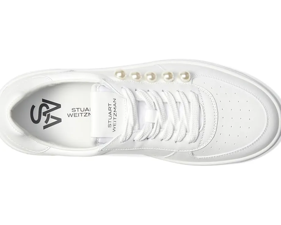 - Stride with confidence wearing the timeless and iconic Stuart Weitzman® Courtside Pearl Sneaker. Crafted from leather upper, lining and insole, this pair of cute shoes features low-top silhouette, round toe, faux pearl detailing on one side, lace-up closure and brand detailing on the tongue and footbed.