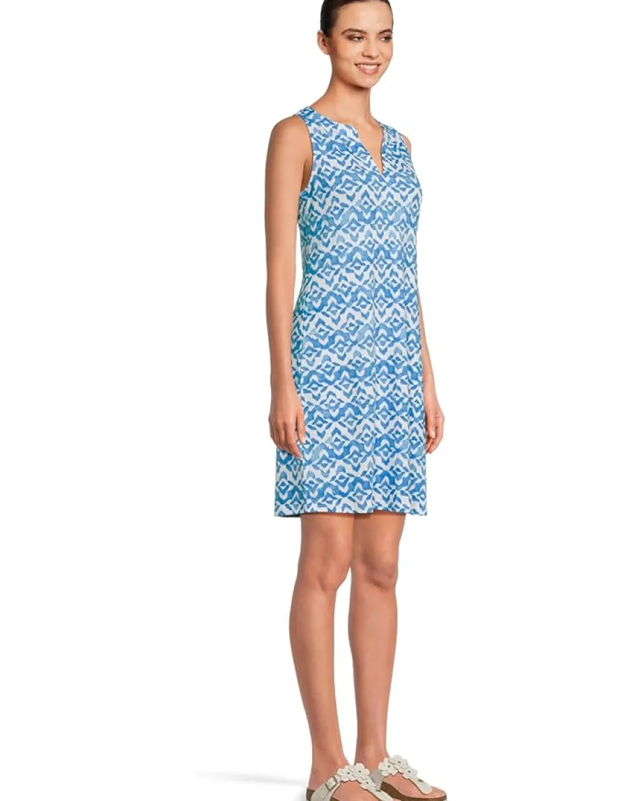 - Elegant printed sheath dress with a hint of stretch. Fashionable split neckline. Back zipper closure, UPF 30 (very good UV protection). Wrinkle resistant.