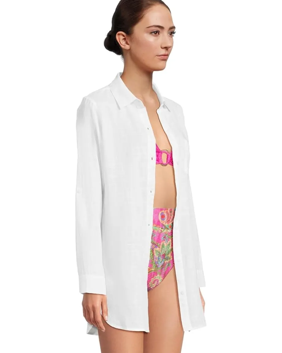 - The Tommy Bahama® Shoreline Cotton Boyfriend Shirt is a great choice to match your casual and formal styles. Its buttoned front closure offers easy wear. Made from cotton fabric that takes your comfort to the next level, this button-down shirt is styled with long sleeves, single cuffs, a collared neckline, and a shirttail hem.