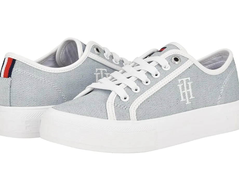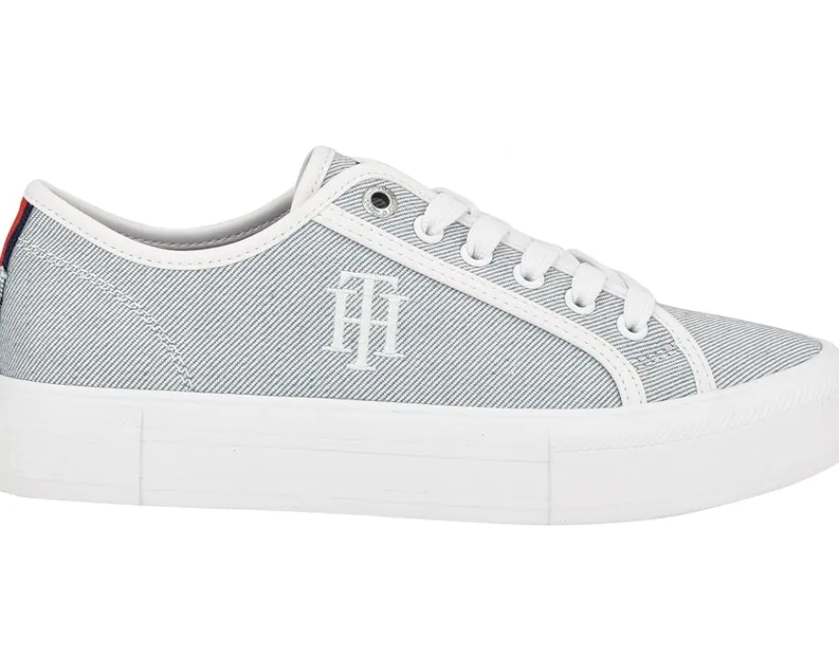 - Designed for comfort and style, the Tommy Hilfiger® Alezya are perfect addition to your sneaker collection. The slip-on style shoes have a lace-up closure, a round-toe design, and branded stacked TH logo woven into the fabric. The low top shoes have denim textile/faux leather upper, polyester textile lining, and foam footbed for added comfort during the prolonged wear.