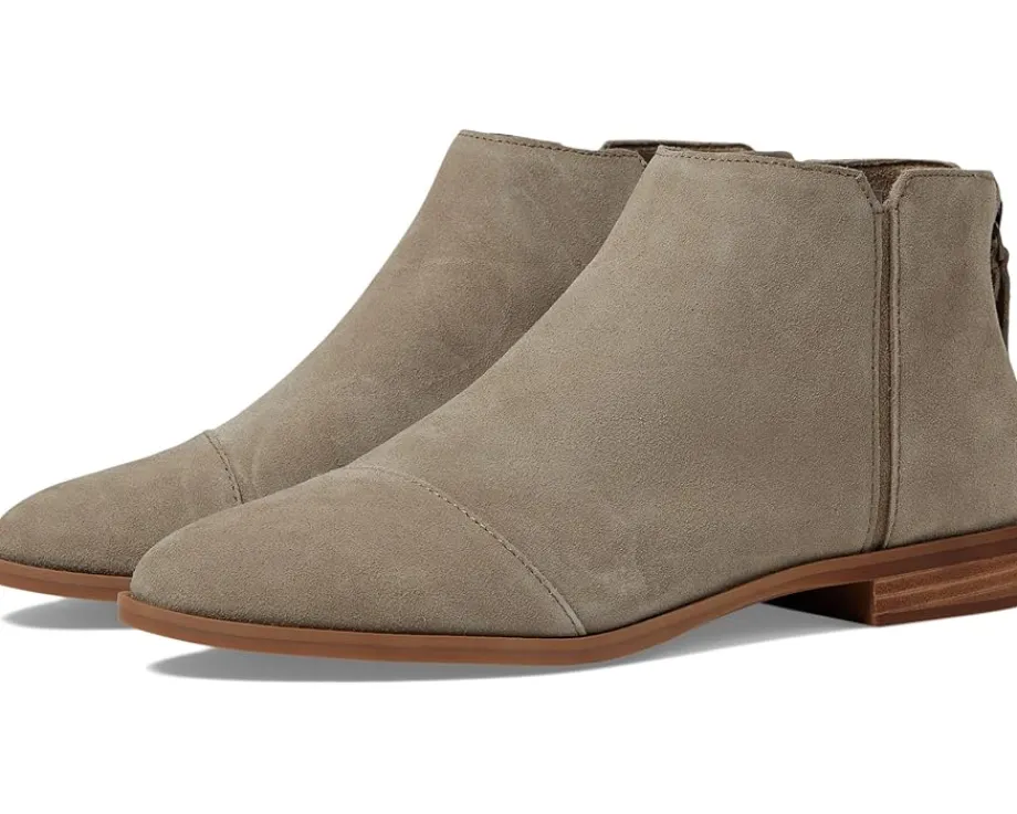 - Conquer the day wearing the classic TOMS® Rylie. Crafted from suede upper, polyester lining, and polyurethane insole, this pair of flat ankle booties features zippered back closure, almond toe, topline cutout detailing with quarter underlay, and stacked leather wrapped heel for a modern look.