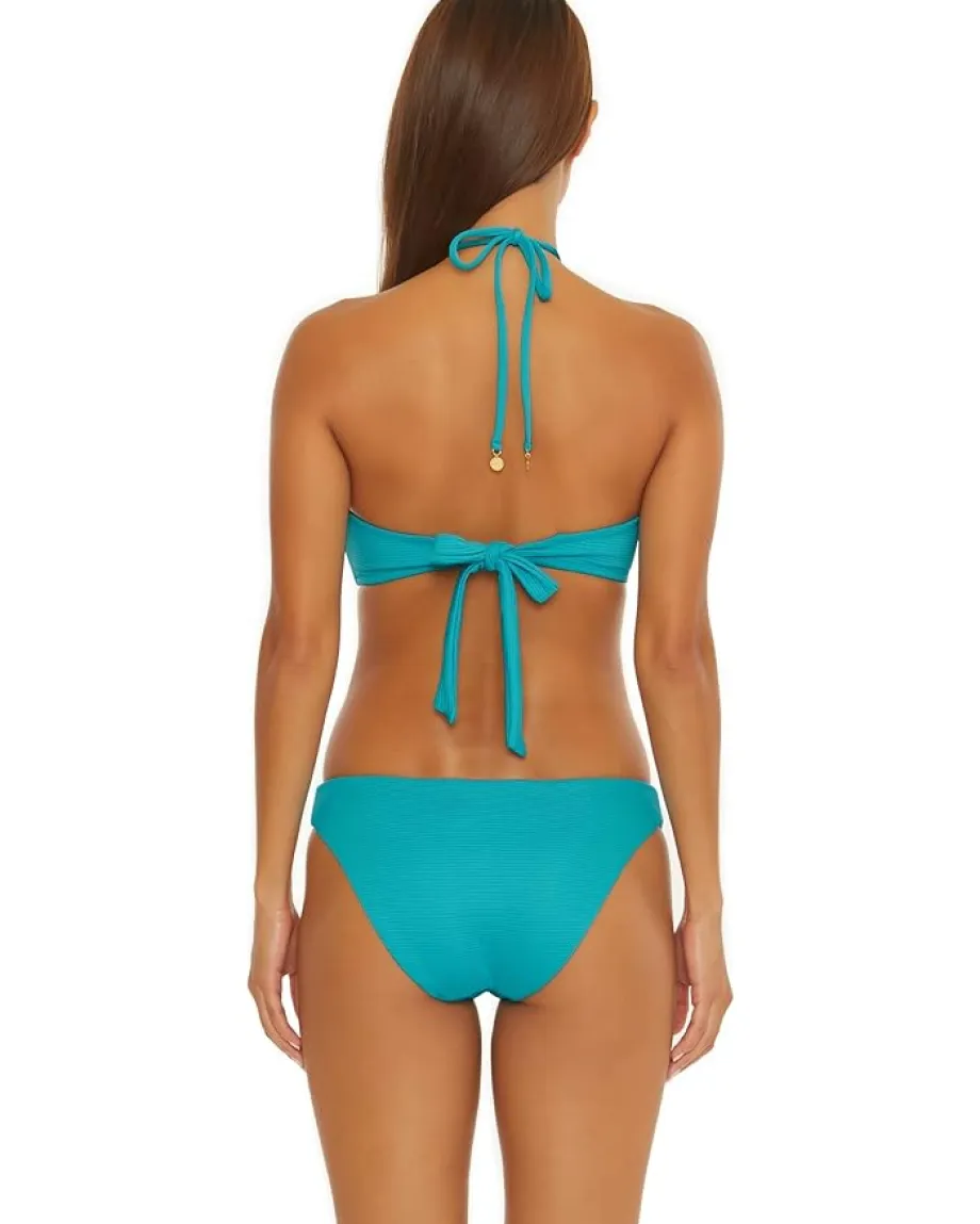 - Bandeau neckline with center v wire on the front to merge a halter strap that ties at the back.