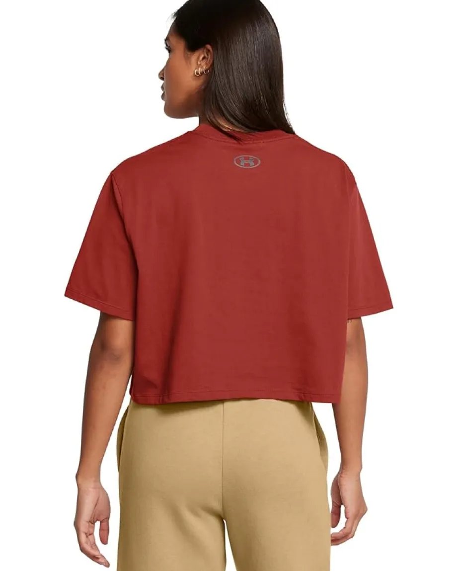 - Designed to match your everyday comfort and style, the Under Armour® Boxy Crop Logo Short Sleeve T-shirt is a great choice for matching your casual styles or lounging at home. The polyester fabric of the tee offers all-day comfort and durability. This plain T-shirt is styled with short sleeves, a crew neckline, and a straight hem. This cropped tee is perfect to pair with casual trousers and denim shorts.