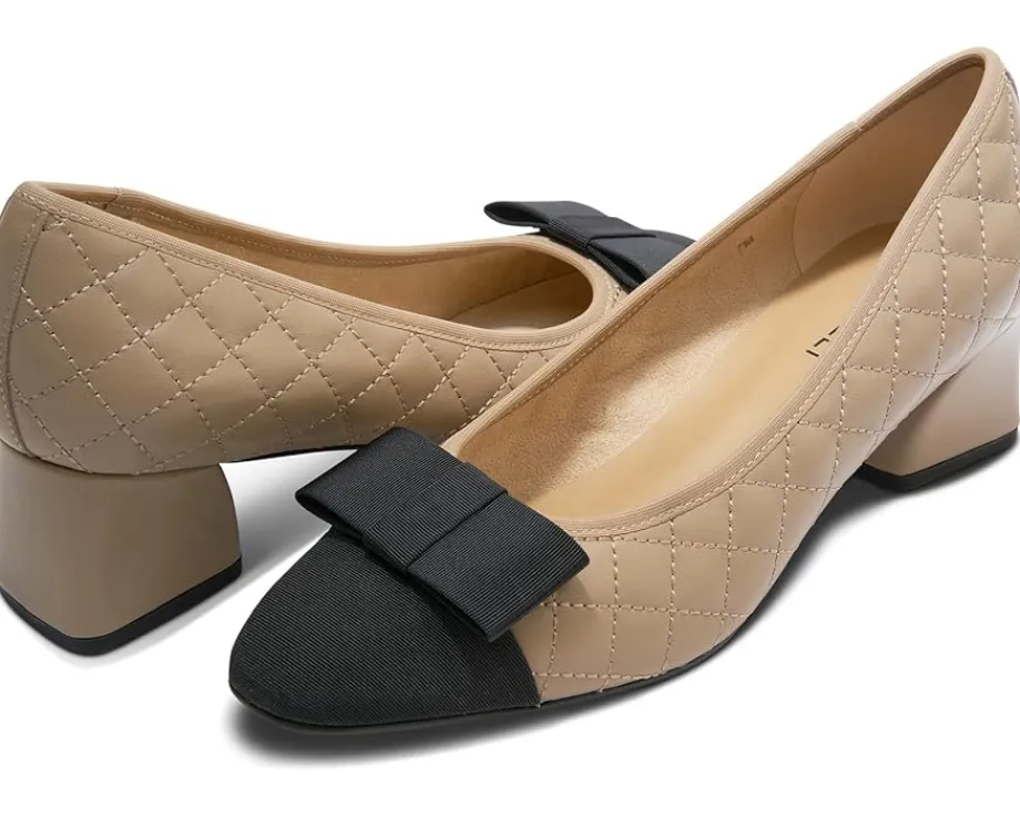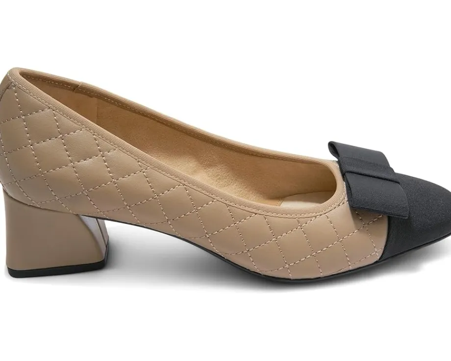 - A sculpting bow and diamond quilting pattern give the Vaneli® Zander Pumps a classic look. The slip-on footwear features leather upper construction with a block heel and almond toe silhouette.