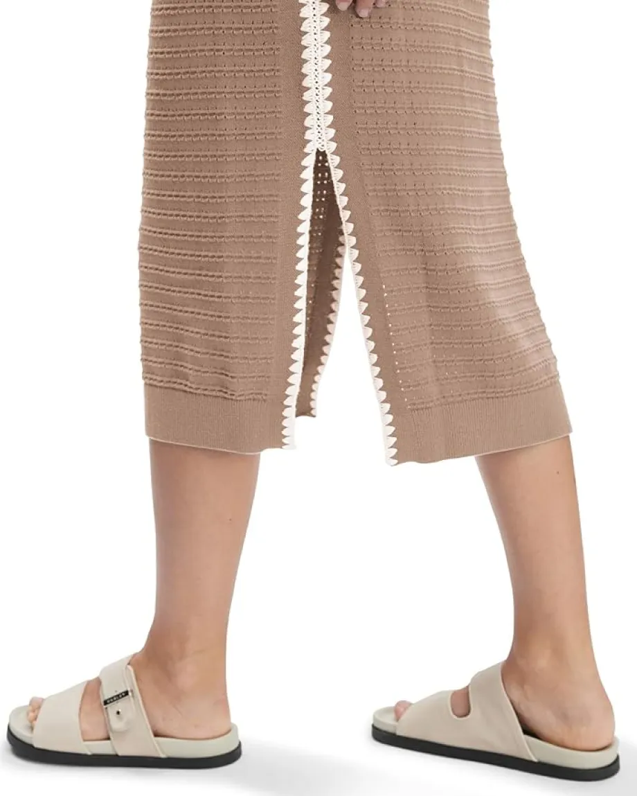 - Step into style adorning Varley trendsetting Dwight Tank Knit Dress. Enhance your wardrobe with its elegant midi-length, side slits, and scalloped stitched edging for a touch of sophistication. Perfect for any occasion, this dress boasts a comfortable crew neckline, making it a versatile choice for day-to-night wear.