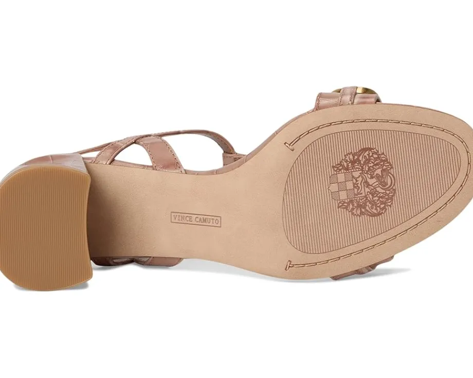 - Chain link charm redefined in the Vince Camuto® Chirie Chain Link Block Heel Sandals. Crafted from refined crocodile-embossed leather in a dreamy chai latte hue, this sandal radiates modern charm from every angle. The open-toe T-strap silhouette features a graceful ankle strap with a gold-tone buckle for a secure, customized fit, while the bold gold chain detail across the vamp adds eye-catching polish. A sturdy block heel offers wear-all-day comfort without compromising style.