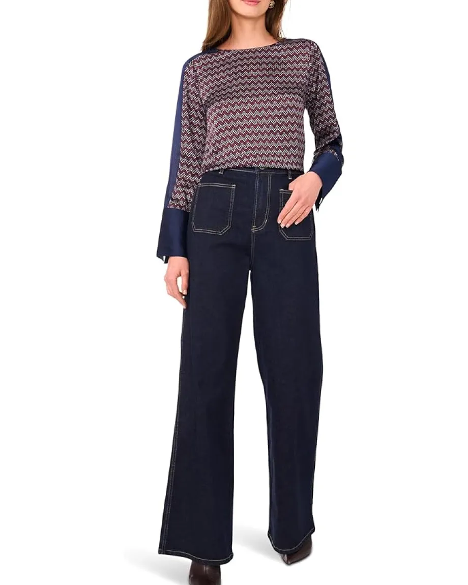 - The Vince Camuto® Crew Neck Extended Shoulder Long Sleeve Blouse with Wide Cuff is a must-have essential to your everyday style. Featuring a jewel neckline with long sleeves, flared button closure cuffs and a back keyhole with button-and-loop closure.