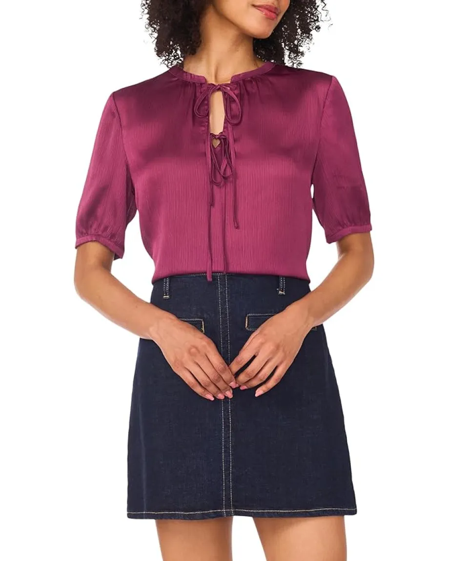 - Cut in a glossy textured satin, the Vince Camuto® Front Two Ties Short Sleeve top is accentuated by dainty front ties and abbreviated elbow-length sleeves. Its jewel neckline and straight hem add to its style. Get ready for any party or occasion with this satin top.