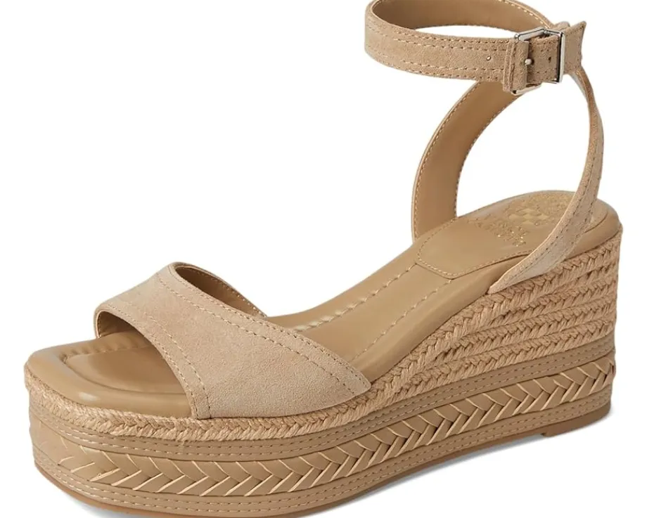 - Vince Camuto® Lilla Espadrille Wedge sandals are built for the bold. Crafted from leather upper, and mesh lining, this pair of sandals features open round toe, ankle strap, buckle closure, padded footbed, and brand detailing on the footbed.