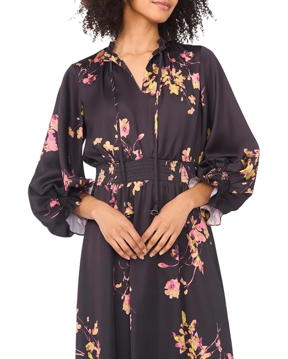 - Bring a touch of wit to your wardrobe with this Vince Camuto® Long Sleeve Maxi Dress With Smocked. This maxi-silhouette features allover iconic floral print work, split V-neckline with drawstring detailing, and smocked detailing on the waist.