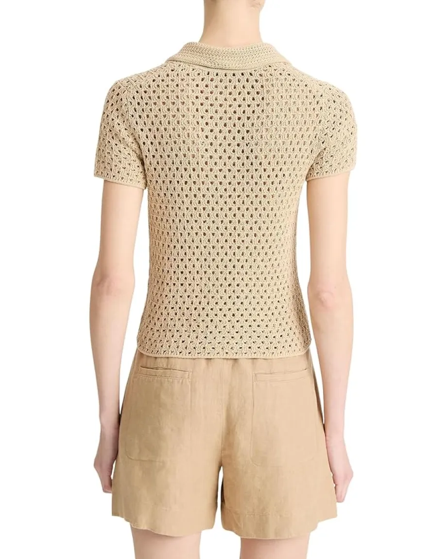 - The Vince® Macrame Henley in textural cotton macrame features an open-knit construction that boasts breathability and an ideal weight for transitional ease. It has a collared V-neckline and short sleeves.