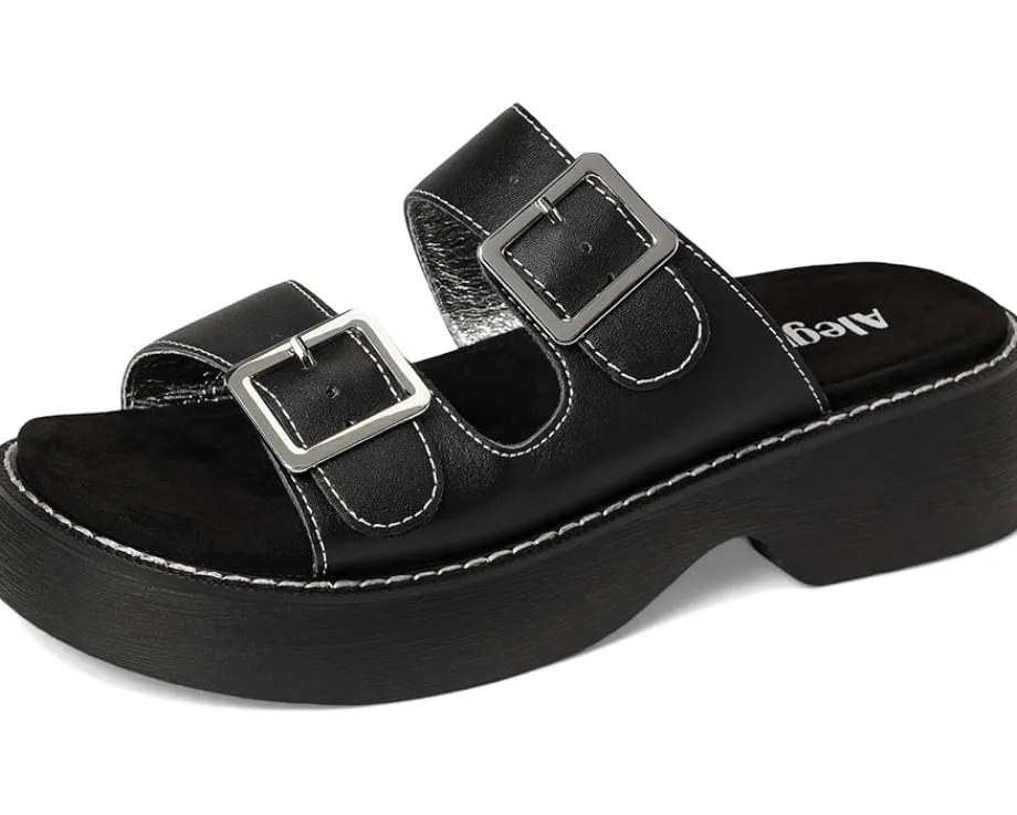 - Support meets style, seamlessly wearing the Alegria® Iza slip-on sandal. Crafted with a premium leather upper and lining, this sleek design wraps your feet in breathable luxury. The double-strap silhouette, featuring adjustable buckle closures, ensures a customized fit while adding a modern touch to your look. A soft faux leather insole cradles your feet, offering lasting comfort, while the lightweight PU outsole delivers superior flexibility and durability.