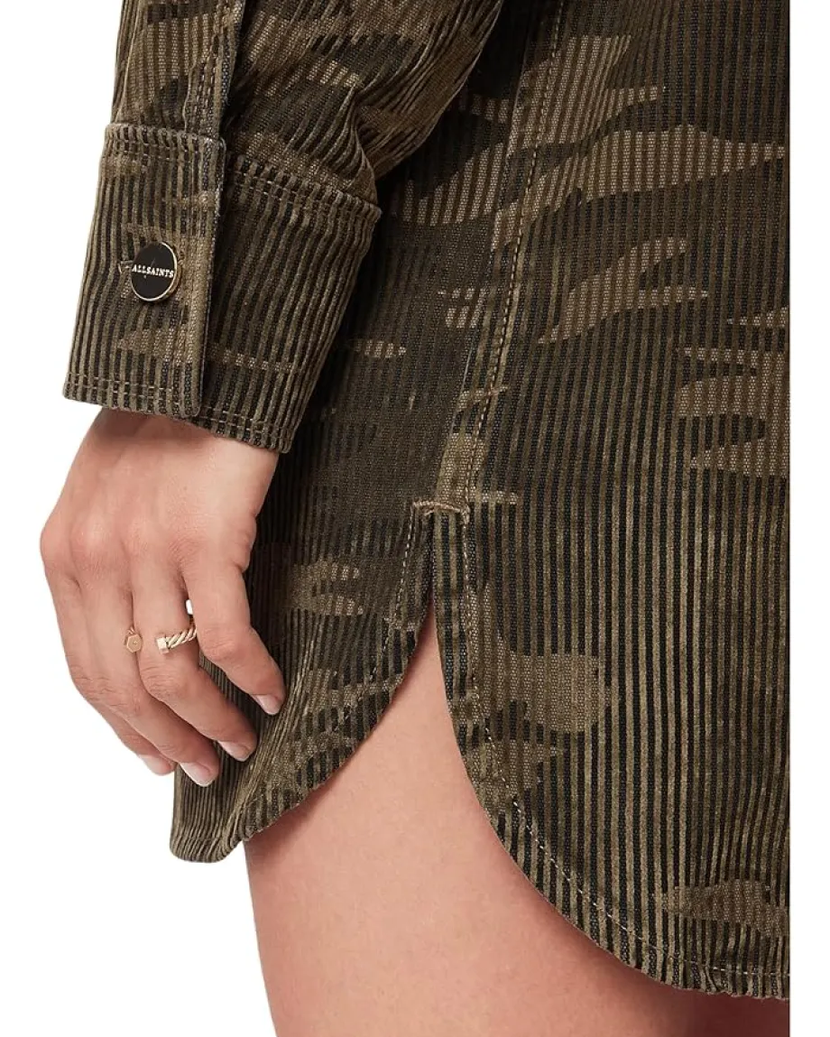 - Give a trendy update to your wardrobe by adding to it the stylish AllSaints™ Faye Flocked Dress. The mini dress features a collared neck, a full front-button closure, long sleeves with buttoned cuffs, and two oversized button-flap pockets on the chest for added functionality. The refined allover print and shirttail hem complete the look.