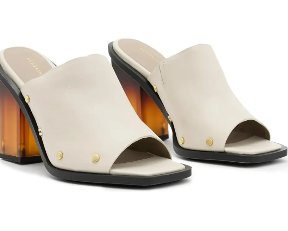 - Uplifted by a high block heel and framed in an open square toe silhouette, the AllSaints™ Kelly Plexi Mules are ready to take your everyday fashion game to new heights. These are crafted with premium leather upper, lining, and insole and feature a simple slip-on design for easy wear. The striking color effect on the heel adds a dramatic touch to this footwear.