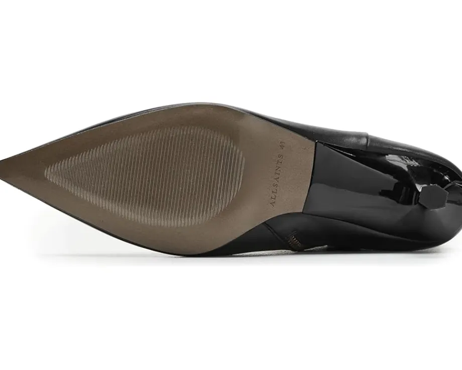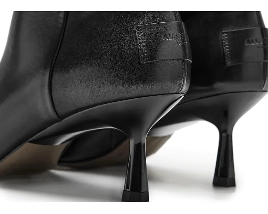 - A stylish spool heel atop the pointy toe defines the sleek look of AllSaints™ Vivian Boots. With a side zipper closure, the mid-calf footwear boasts leather upper and lining construction.