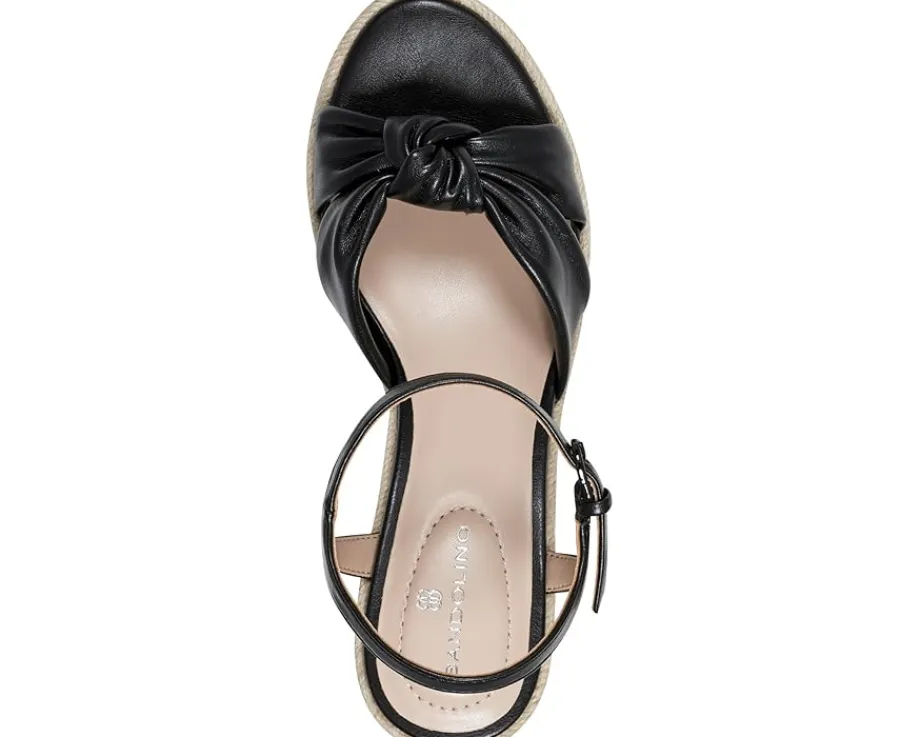 - Give your toes some freedom wearing the Bandolino® Justyne. Crafted from textile upper, man-made lining, and foam footbed, this pair of sandals features open round toe, ankle strap buckle closure, wedge heel, knot detailing on the vamp, and brand detailing on the footbed.
