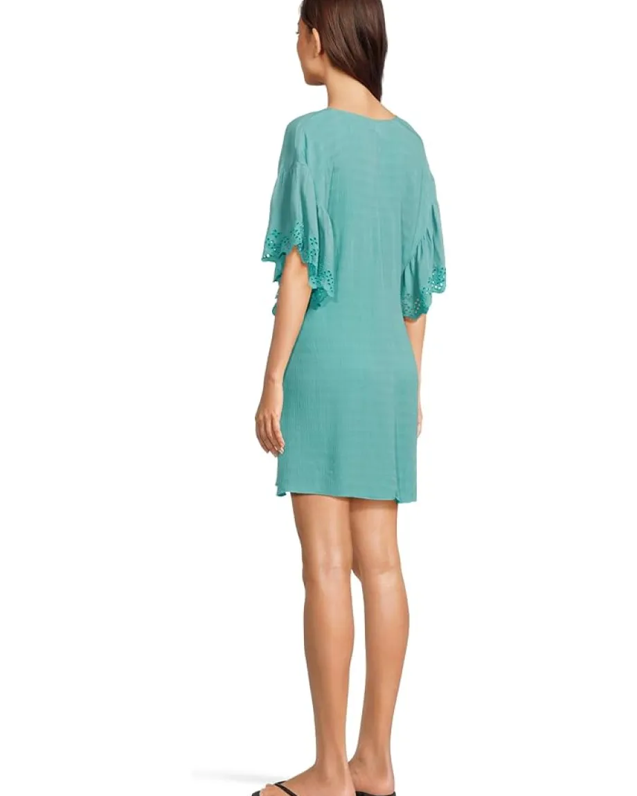 - Don the gorgeous BECCA by Rebecca Virtue® Barbados Tunic at your next beach vacation and amaze them all with its sexy plunge neckline and flutter sleeves that come with side slit openings. The pullover style tunic highlights embroidered eyelet scallop edges with a smocked elasticized front and an uneven hemline.