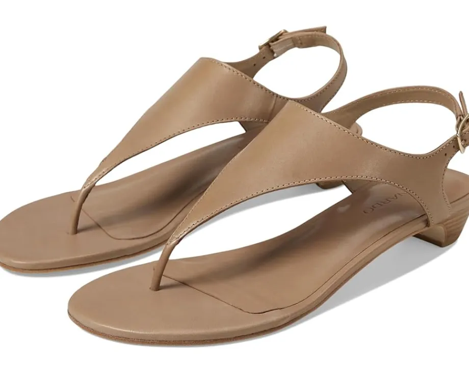 - Keep things elegant yet comfortable wearing the Bernardo® Goldy Thong Sandals featuring a leather upper, lining, and footbed. Heightened by a stacked, mid-block heel, the shoes come structured with an adjustable buckle closure on the slingback strap.
