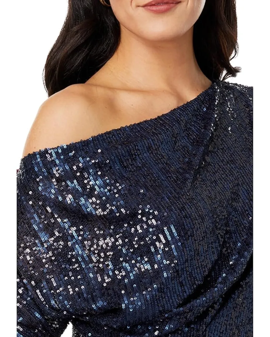 - Become center of attraction in event gala by wearing Betsy & Adam™ Long 3/4 Sleeve Off-the-Shoulder Sequin Dress.
