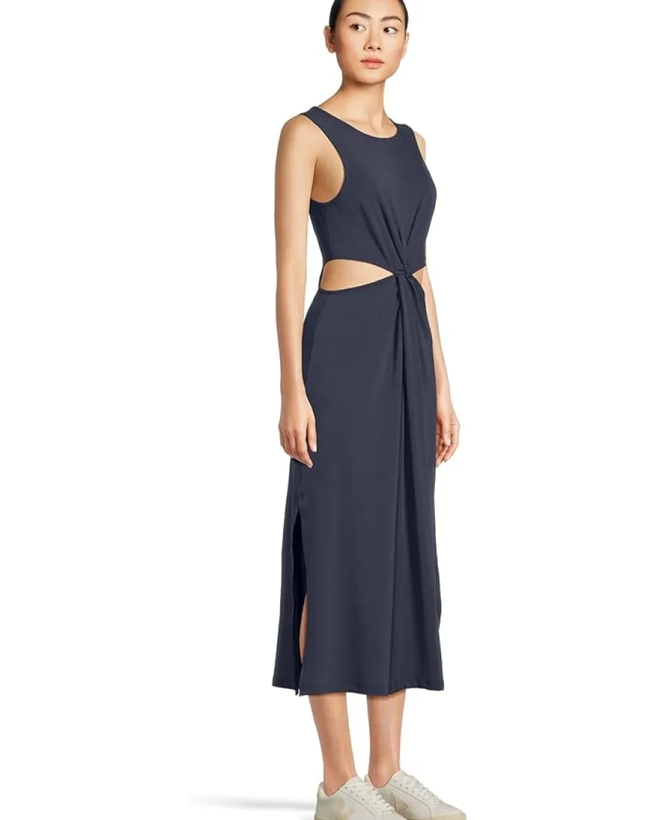 - Jet-set style, everyday ease: Beyond Yoga® Around The World Front Twist Dress. Discover a scoop neckline, sleeveless tank design, and flattering front twist detail for a chic silhouette. Enjoy the comfort of side slits, relaxed fit, and midi length-perfect for any occasion. Whether globetrotting or lounging, this sueded, bouncy, stretchy dress is a must-pack item that effortlessly blends style and comfort.”
