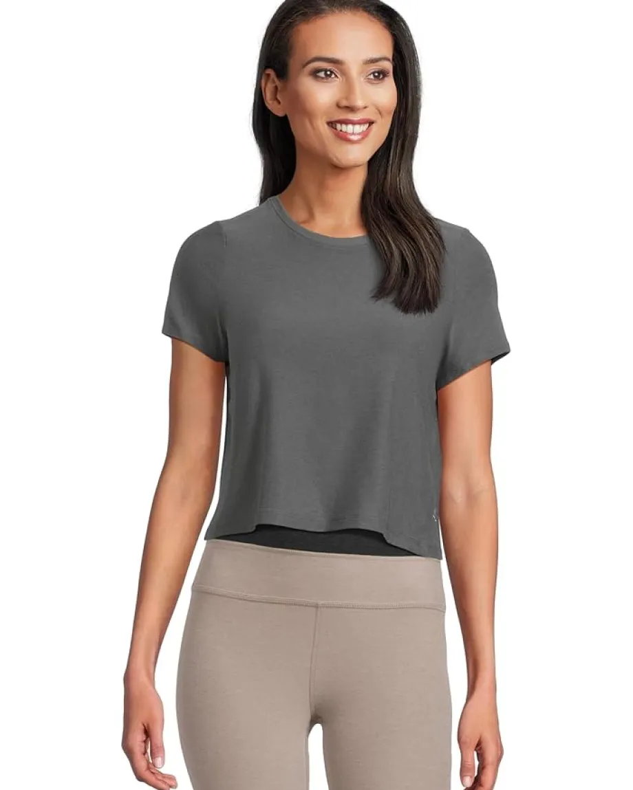 - Light as air, undeniably chic: The Beyond Yoga® Featherweight Supreme Cropped Tee redefines everyday comfort. Featuring a soft, featherlight fabric, this pull-on tee offers effortless style with a relaxed fit and short sleeves. Its design pairs perfectly with high-waisted pants or leggings for a flattering silhouette. Top of the tops. Our simple, straightforward, and completely essential cropped tee with a loose, relaxed fit for cool-without-even-trying comfort. Wear yours to work, weekend plans, and everywhere in between.