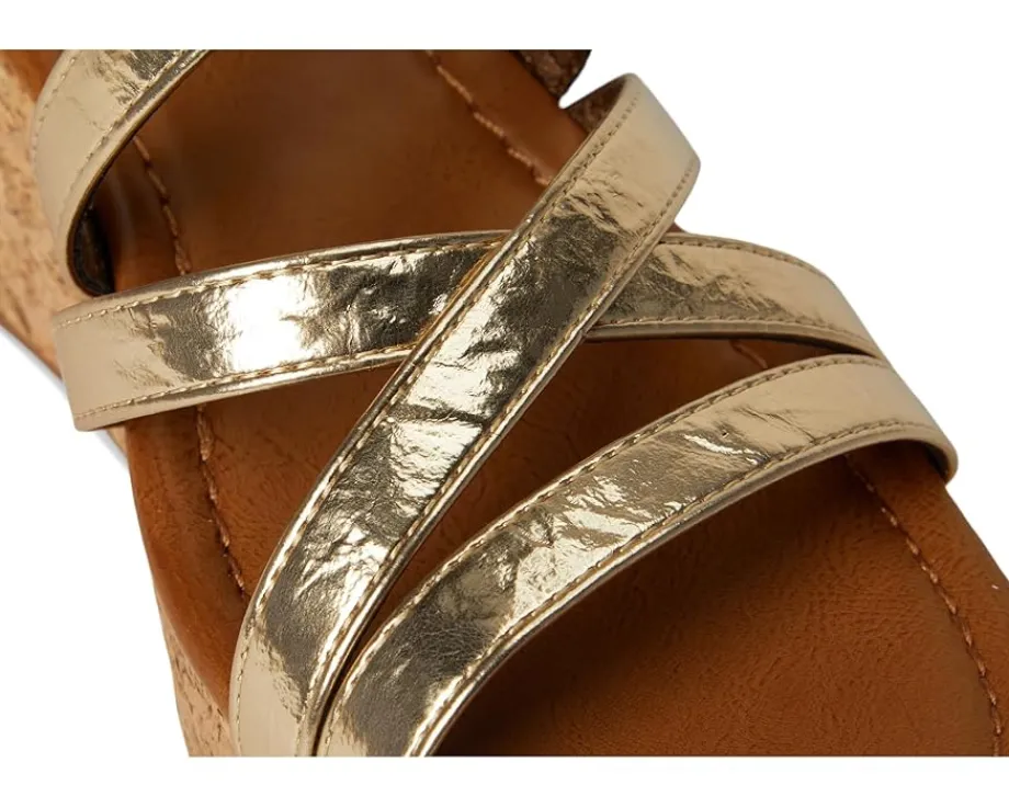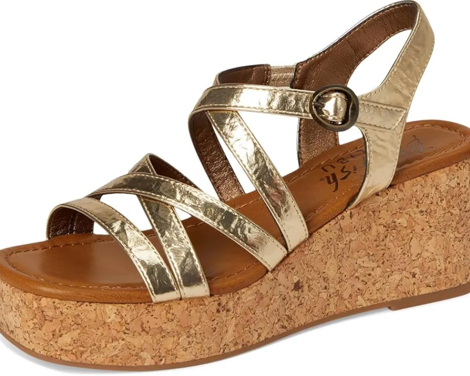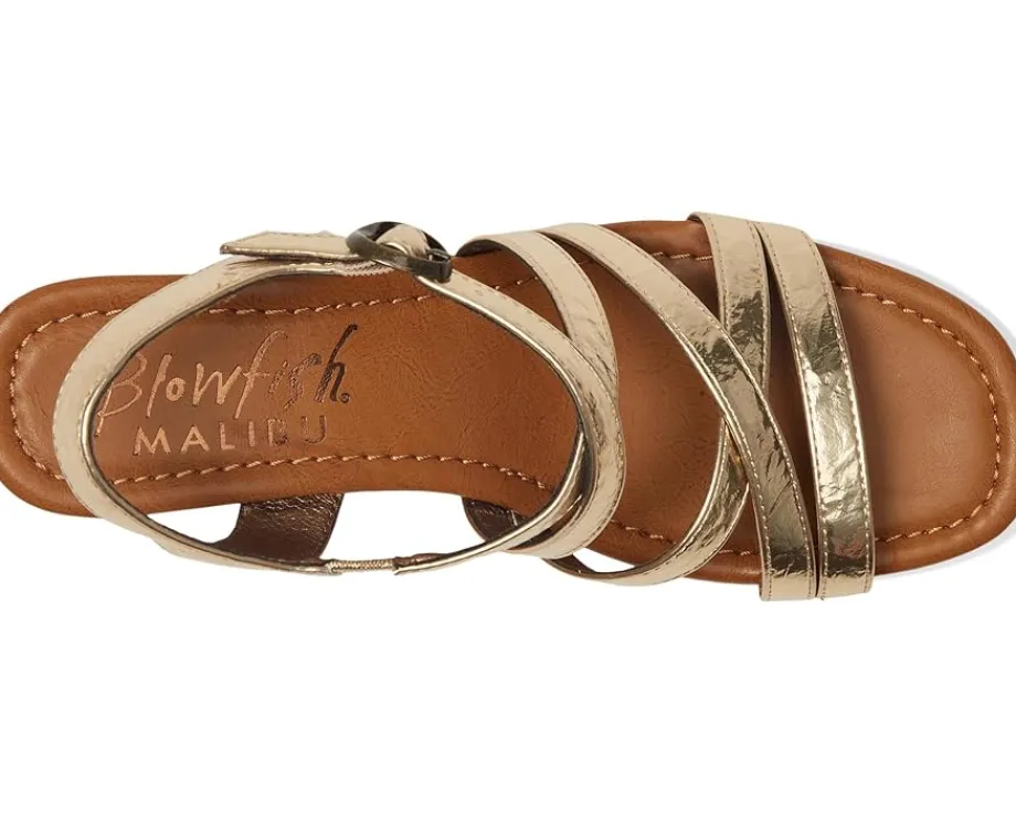 - Update your footwear collection by adding to it the stunning Blowfish® Malibu Aurora Heels. The strappy sandals feature a faux leather upper with a metal buckle closure, polyurethane lining, and a foam insole for lasting comfort. The cork wedge wrap heel adds to the style.