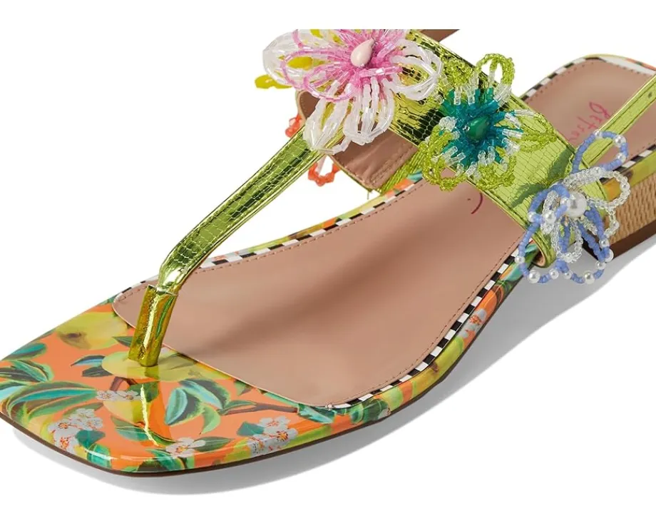 - The Blue™ by Betsey Johnson Jaydda sandals are girly and flirty with their colorful floral adornments. They are made of a faux leather insole and lining. The faux leather upper features an ankle strap with an adjustable buckle closure for a secure fit. These heeled sandals are a great choice to style up your party looks and chic styles.