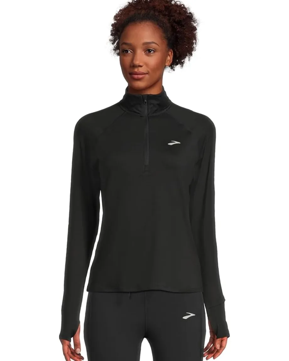 - Engineered for the modern runner, the Brooks® Dash 1/2 Zip 3.0 is your go-to layering essential, delivering distraction-free comfort with lightweight warmth and next-level mobility. Crafted in a semi-fitted silhouette for a streamlined look, it’s built with advanced stretch fabric that adapts to your every move-whether you’re pacing through early morning miles or cooling down post-run. The collared neck with a half-zipper design offers adjustable ventilation, while thumbholes keep sleeves securely in place for a stay-put feel. Reflective branding enhances visibility in low-light conditions, ensuring you’re seen and safe. The pull-on design and smooth construction eliminate bulk and chafing, making it ideal for layering without compromising breathability or performance.